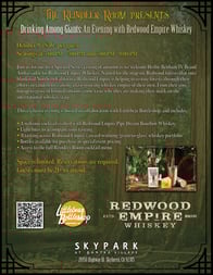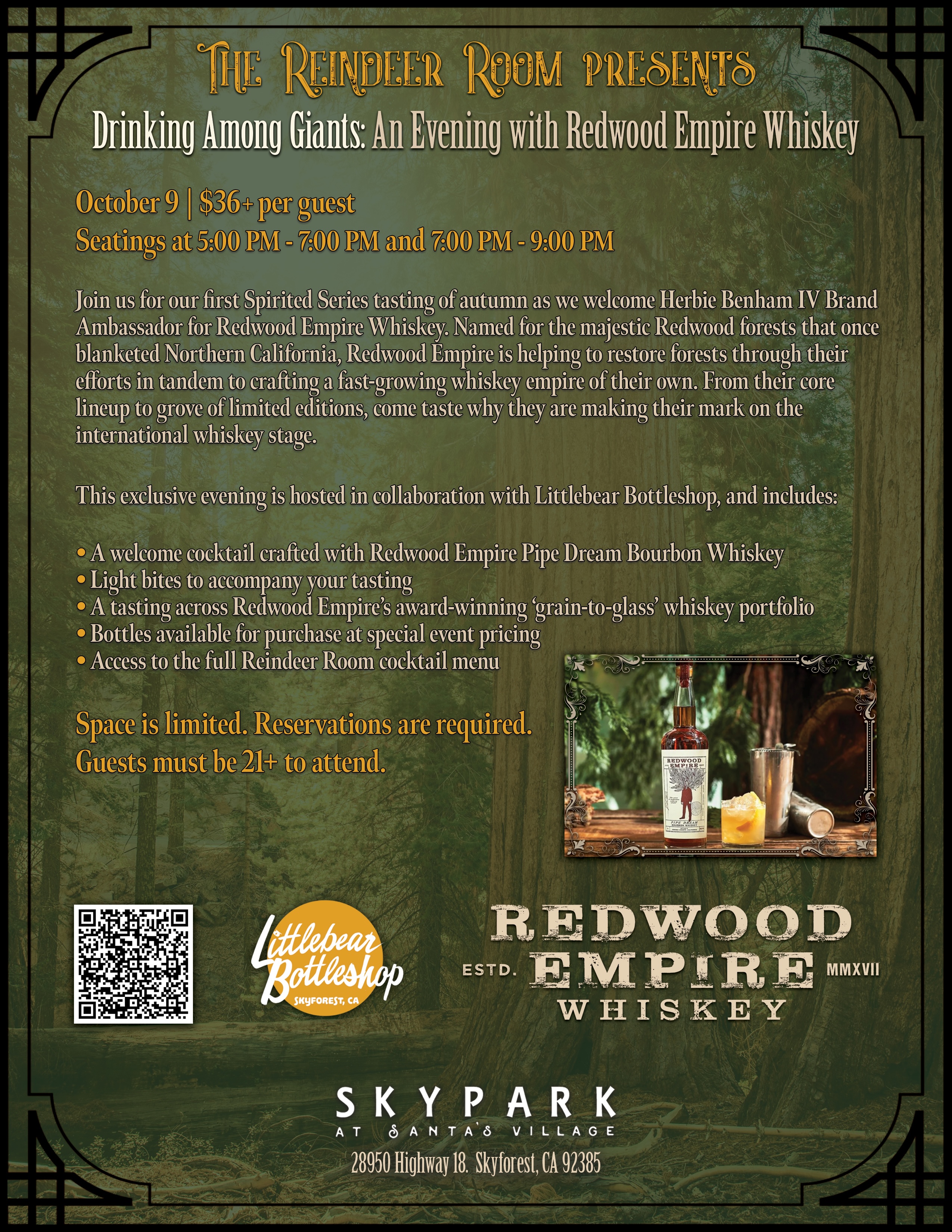 - Drinking Among Giants: An Evening with Redwood Empire Whiskey The Reindeer Room at SkyPark at Santa’s Village Thursday, October 9th | $36+ per guest Two-hour Seatings: 5:00 PM-7:00 PM & 7:00 PM-9:00 PM Join us for our first Spirited Series tasting of autumn as we welcome Herbie Benham IV, Brand Ambassador for Redwood Empire Whiskey. Named for the majestic Redwood forests that once blanketed Northern California, Redwood Empire Whiskey is helping to restore forests through their efforts in tandem to crafting a fast-growing whiskey “empire” of their own. From their core lineup to grove of limited editions, come taste why they are making their mark on the international whiskey stage. This exclusive evening is hosted in collaboration with Littlebear Bottleshop, and includes: -A welcome cocktail crafted with Redwood Empire Pipe Dream Bourbon Whiskey -Light bites to accompany your tasting -A tasting across Redwood Empire’s award-winning ‘grain-to-glass’ whiskey portfolio -Bottles available for purchase at special event pricing -Access to the full Reindeer Room cocktail menu Guests will enjoy an intimate, 2-hour experience at the Reindeer Room, guided tasting, followed by continued conversation under the stars on our outdoor patio. Space is limited. Reservations required. Guests must be 21+ to attend.