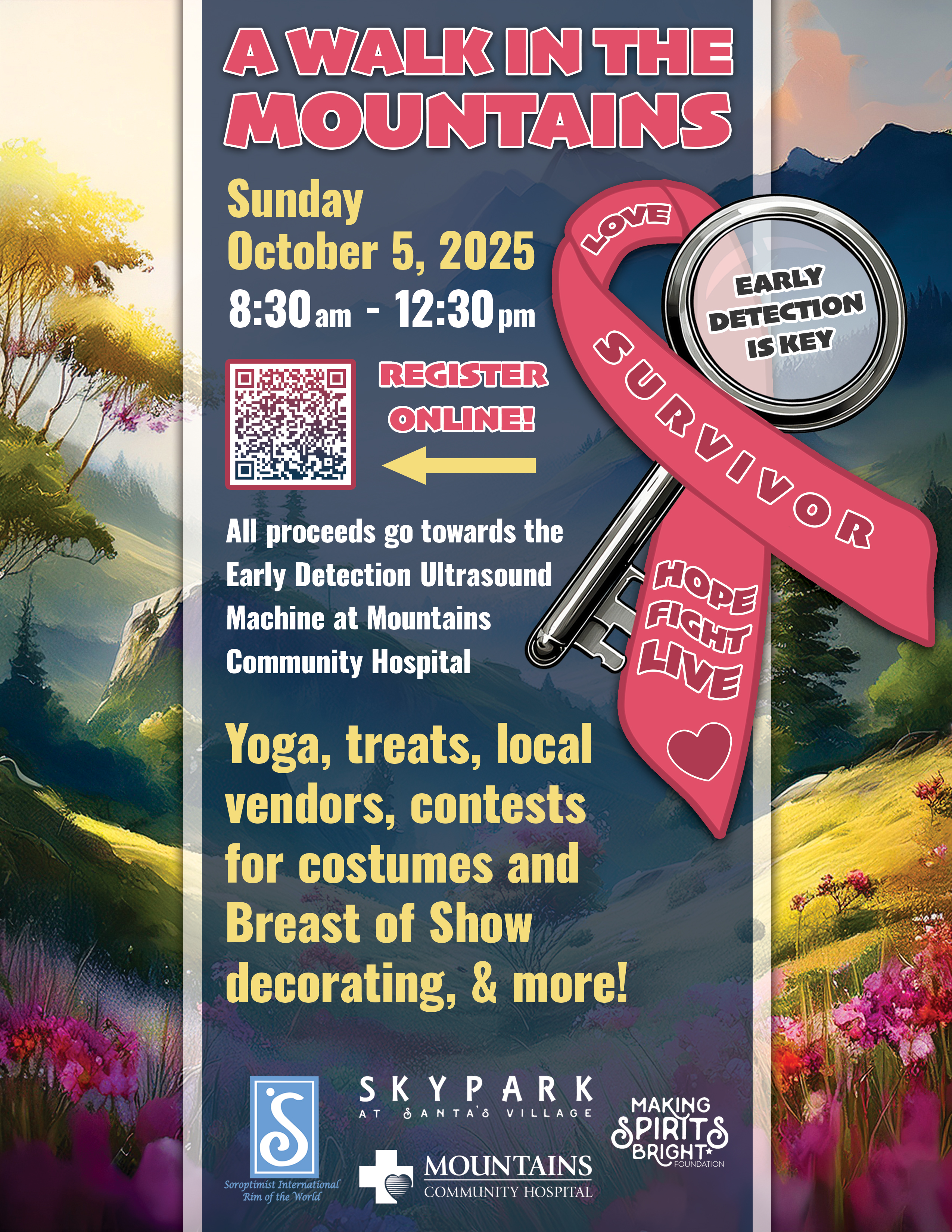 - 8:30 AM - 12:30 PMA Walk in the Mountains Early Detection Is Key! Breast Cancer Awareness Walk Join us as we Walk to Remember, Inspire, and Celebrate on Saturday, October 5th, from 8:30am-12:30pm. Event Only Registration: Includes Breast Cancer Awareness Walk (8:30am–12:30pm). Event & Park Admission: Walk plus discounted access to SkyPark activities for the rest of the day. Let’s come together on the mountain to raise awareness, offer support, and honor the strength of those touched by breast cancer. A day of unity, hope, and healing. All proceeds go towards the Early Detection Ultrasound Machine at Mountains Community Hospital. Whether you are walking for a loved one, for yourself, or for the future, your presence makes a difference! Event Highlights: -Scenic Walk through Meadowlands or NorthWoods Hiking Trail -Yoga on the Creekside Lawn -Goodie Bags for Participants -Silent Auction featuring generous local donations -“Breast of Show” Bra Decorating Contest – Get creative ahead of time! All bras should be decorated before the event and brought for judging. -Costume Contest -Special Food & Beverage Offerings