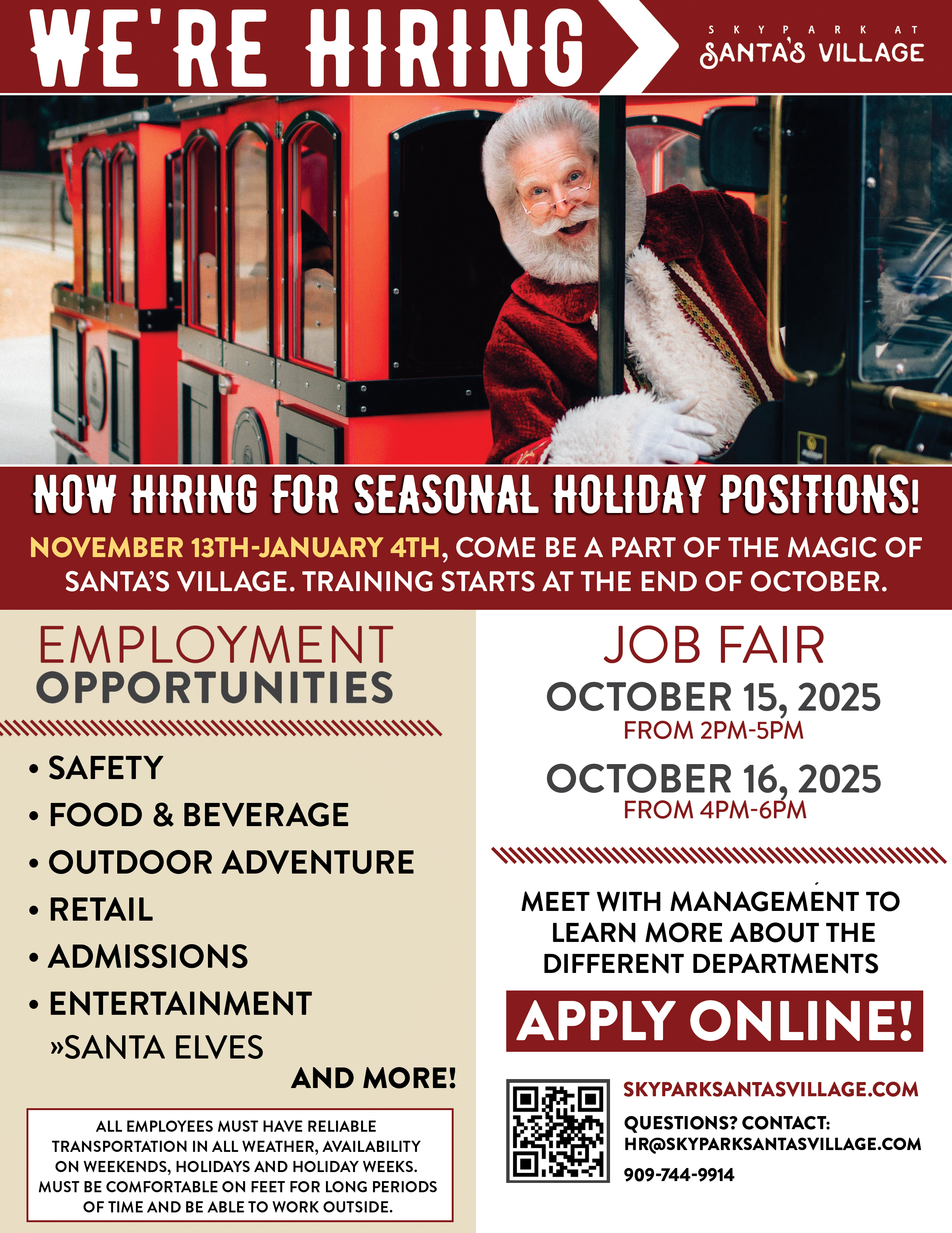- 4:00 PM - 6:00 PMCome be a part of the magic of Santa's Village! SkyPark is now hiring for seasonal holiday positions. Join us for two Job Fairs on Wednesday, October 15th from 2PM-5PM or Thursday, October 16th from 4PM-6PM. Meet with management to learn more about the different positions available: -Safety -Food & Beverage -Outdoor Adventure -Retail -Admissions -Entertainment -And more! All employees must have reliable transportation in all weather, availability on the weekends, holidays and holiday weeks (closed Thanksgiving Day, Christmas Day and New Year's Day). Please see our website for full job descriptions, salary ranges, and to submit your application in advance. We look forward to meeting you and having you become part of our Village! Questions? Contact: HR@skyparksantasvillage.com or call 909-744-9914 (Mondays-Fridays).