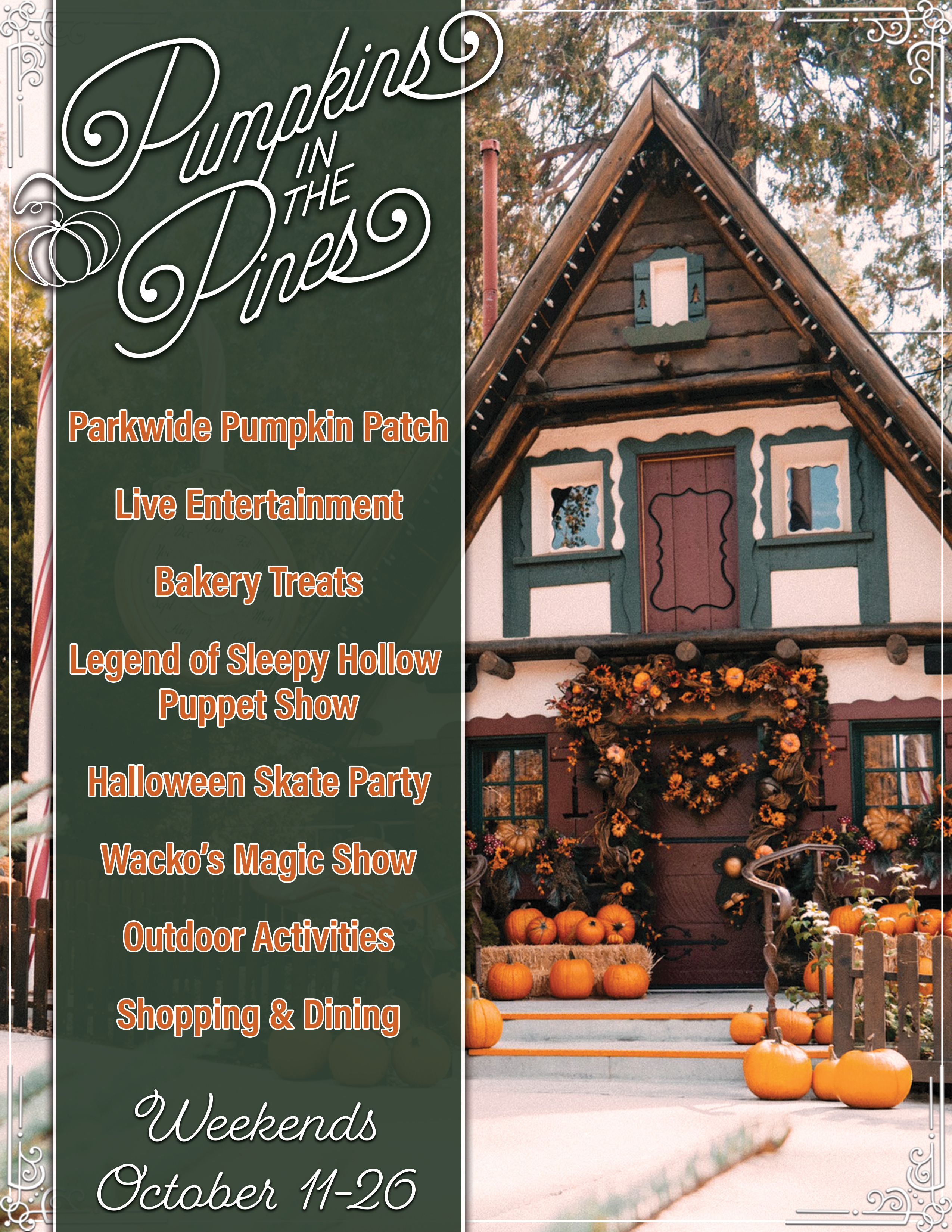 - Starts 10:00 AMAs the leaves turn gold and a chill returns to the mountain, we begin to think fondly of all things that accompany the fall: colorful leaves, apple cider, cozy sweaters, and the return of our fall festival, Pumpkins in the Pines! Saturdays and Sundays from October 11-26, join us for a parkwide pumpkin patch, seasonal food & beverages, pumpkin painting, the Legend of Sleepy Hollow Puppet Show, and more! Celebrate the fall season with family-friendly outdoor activities and abundant photo ops. And don’t forget to stop by Kringle’s Coffee & Gifts for the best pumpkin spice latte on the mountain! Check the Entertainment Schedule when you arrive for showtimes, character meet-and-greets, and special events. Access to Pumpkins in the Pines is included with a Day Pass or Annual Pass, plus all daily park activities and mountain bike trails.